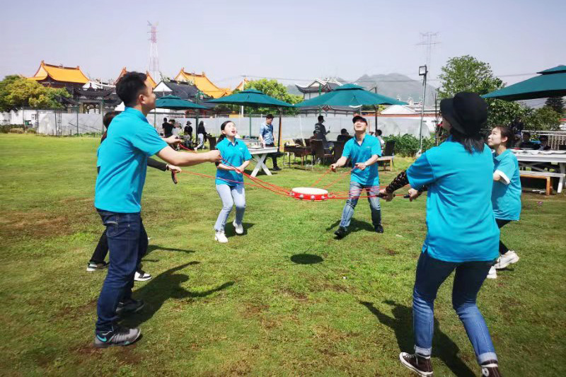 首先從“同心擊鼓”這個(gè)游戲開(kāi)始,全體員工誰(shuí)也不能松懈,手持鼓繩,齊心協(xié)力擊打鼓聲。